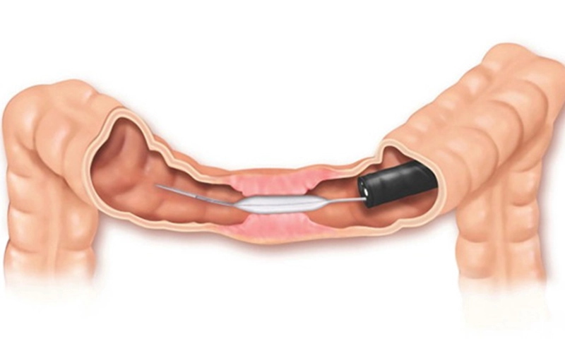 2. Estenoses benignas: inflamações crônicas (como Doença de Crohn, Retocolite Ulcerativa), colite por radioterapia, infecções ou cicatrizações pós-operatórias podem causar estreitamentos. Nesses casos, utiliza-se a dilatação endoscópica com balão.